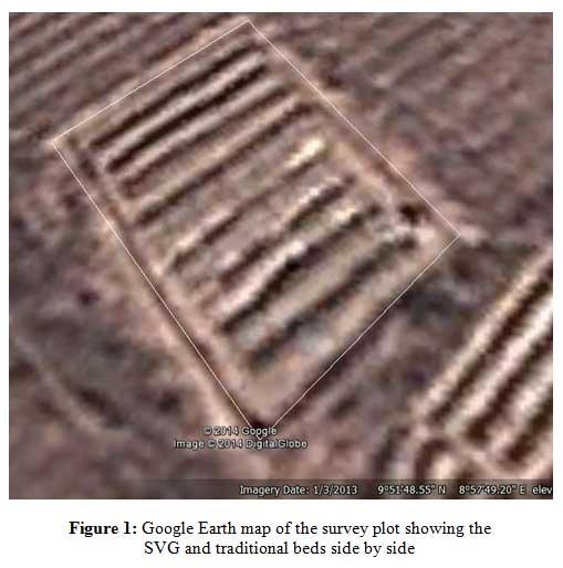 Figure 1: Google Earth map of the survey plot showing the SVG and traditional beds side by side. Click here to View figure |