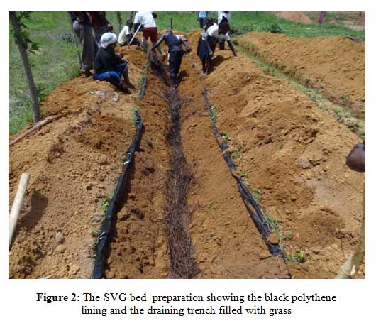 Figure 2:The SVG bed preparation showing the blackpolythene lining and the draining trench filled with grass. Click here to View figure |