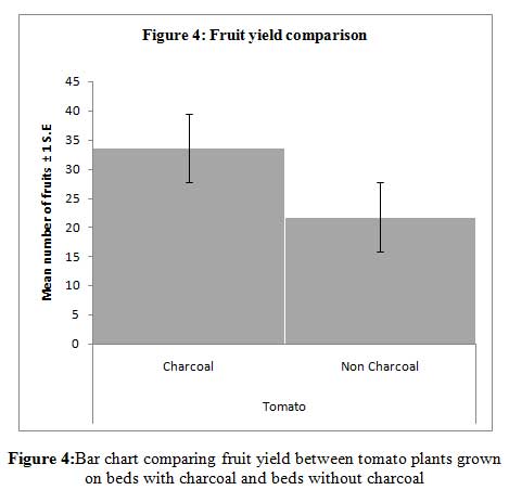 Figure 4: Bar chart comparing fruit yield between tomato plants grown on beds with charcoal and beds without charcoal. Click here to View figure |