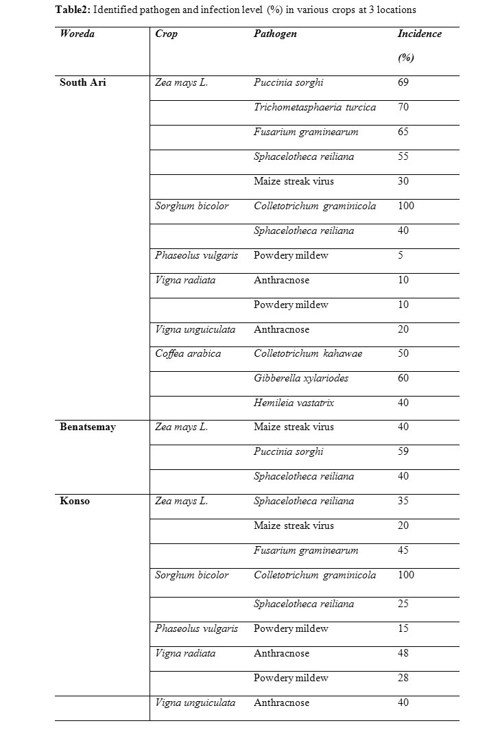 Maize and Sorghum are the major cereal crops in South omo and Segen people’s zone. The major pathogens that cause disease in maize are Puccinia sorghi, Trichometasphaeria turcica, Fusarium graminearum, Sphacelotheca reiliana, and Maize streak virus (Tabel 2). Where as in sorghum the major diseases causing pathogen are Colletotrichum graminicola and Sphacelotheca reiliana. In addition to maize, sorghum, haricot bean, cow pea and mung bean are the major pulse crops in these zones. The pathogen that cause diseases in these pulse crops in two zones are powdery mildew and Anthracnose