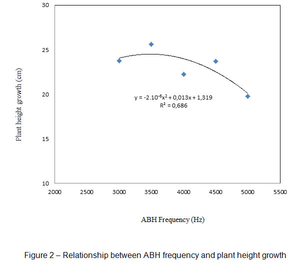 The relationship between ABH frequencies and plant height growth is presented in Figure 2. The value of the determination coefficient is 0.686, and the curve equation is (Y = -2.10-6 X2 + 0.013 +1.319) (Figure 2). X values that represent the best frequency is 3481.7 Hz, so this can be recommended for height growth of rubber nursery.