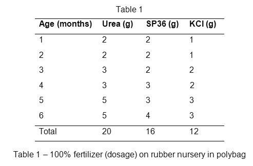Table 1: 100% fertilizer (dosage) on rubber nursery in polybag. Click here to View table |