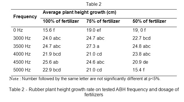 Table 2: Rubber plant height growth rate on tested ABH frequency and dosage of fertilizers. Click here to View table |