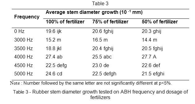 Stem diameter growth rate is affected by ABH frequency and dosage of fertilizers (Table 3). The results showed that the application of sound wave had a significant effect on rubber stem diameter growth, while fertilizer dosage level had no significant effect on these variables. Both factors did not showed interaction with in each other. The best diameter growth was performed at 4000 Hz and 50% level of fertilizer (Table 3). Stem diameter growth at the level of fertilizers 100%, 75% and 50% on 3500 Hz were not significantly different.