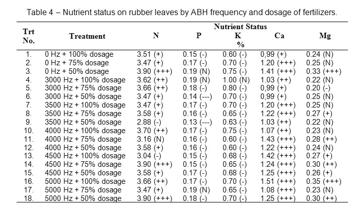 Table 4: Nutrient status on rubber leaves by ABH frequency and dosage of fertilizers. Click here to View table |