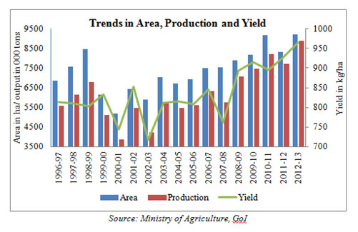 Oilseed and pulses are the important part of human diet as they are rich sources of proteins and quality nutrition. There are several pulse and oilseed crops sown as commercial crops in India. In India, pulse crops occupy an area of 23.82 million hectares with a production of 14-15 million tones. In the Northern India, pulses are generally grown for home consumption and generally those fields are selected, which are not suitable for other cereal crop like paddy and wheat.  As a result, pulses production is not fulfilled the demand of the present population of the country and these are imported to the tune of 0.5 to 1.5 million tones.5 They also play vital role in sustainable agriculture through the concept of crop diversification. A Technology Mission on Oilseeds and Pulses (TMOP) was organized for enhancing productivity and decreasing the use of foreign exchange on the import of these crops, which was about of Rs. 1000 crore per year. This mission followed an integrated policy using four partners as farmers, consumers, processing industry and trade for improving the economy of the country. Front line demonstration (FLD) was observed to be major constituent for the policy of TMOP. The FLDs are the one of the systematic methods to test the potential of technology at the farm by acquiring the participating farmers and its adoption by non-participating farmers. Modern crop management practices like fertilizer application, weed control and fungicide spray are developed and are generally seen these are not adopted by the farmers. There is observed a difference in productivity and returns from the crops due to the gap between recommended and farmers’ practices. The consideration of the above, the FLDs of gram were carried out by KVK, Amritsar at farmer’s fields in irrigated conditions in Rabi from 2009-10 to 2013-14. The goals of the study are given below: