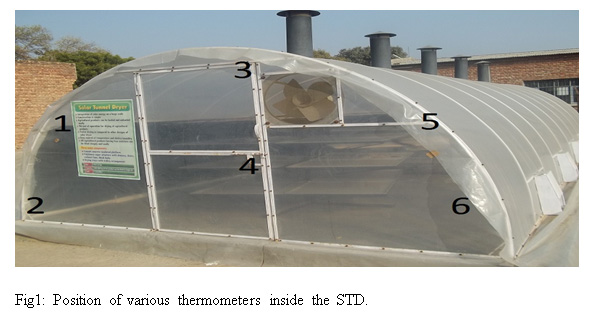 A low cost Solar Tunnel Dryer of different capacity for drying of fruits & vegetables and other agro industrial products was developed at MPUAT, Udaipur. Realizing the importance and use for the upliftment of farmers similar dryer with a floor area of 10m × 3.75m was installed at Hisar to evaluate its performance in ambient conditions of Haryana. The solar tunnel dryer is framed using UV-stabilized polythene sheet of height 1.98 meter. The orientation of tunnel solar dryer is in the east – west direction to use maximum sunlight.