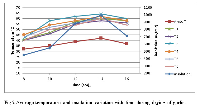 Figure 2a: Average temperature and insolation variation with time during drying of garlic Click here to View figure |
