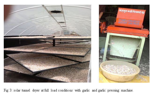 The solar intensity, ambient and temperature inside solar tunnel dryer were measured every two hour interval till the end of drying. After attaining safe moisture the products were removed from the dryer. Fig3 (a) shows solar tunnel dryer at full load conditions and (b) garlic pressing machine.