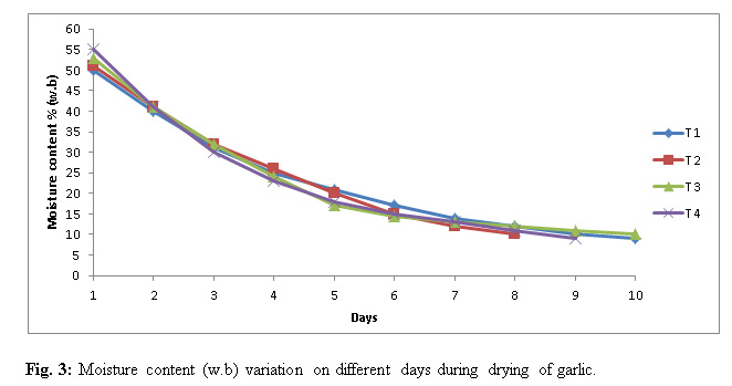 Figure 3: Moisture content (w.b) variation on different days during drying of garlic. Click here to View figure |