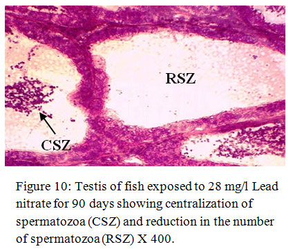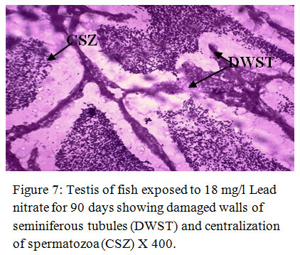 Figure 7: Testis of fish exposed to 18 mg/l Lead nitrate for 90 days showing damaged walls of seminiferous tubules (DWST) and centralization of spermatozoa (CSZ) X 400. Click here to View Figure |