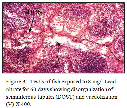 Similar results were seen by18 in case of Lepomis macrochirus exposed to endosulfan for 24, 48, 72, 96 hr, 1 and 2 week periods. The histopathological alterations in testes of fish showed connective tissue breakage, dilation of lumens, reduction in the size of primary spermatogonia, breakage of primary spermatocyte walls, greater increase in the size of seminiferous tubules and lumens, damaged sertoli cells and spermatids, damaged primary spermatogonia, decrease in the number of spermatozoa and spermatids, disruption of seminiferous tubule walls and disorganised structure of the testis. Cytolysis, vacuolation in seminiferous tubules, disorganized testicular architecture and extensive damage to germinal epithelium, necrotic cells and connective tissues in the testis of air-breathing fish, Heteropneustes fossilis due to the exposure of cadmium chloride for 45 days was also reported by.19 Loosening and indistinguishable arrangement of tissue, disorganization of the lobules, disintegration of the spermatogonia and interstitial tissue, epithelial vacuolization, disorganization of germ cells, reduction in the number of spermatogonia in the testis of African catfish Clarias gariepinus exposed to 0.05 mg/l of mercuric chloride for 60 days was observed by.20 It is construed from our study that the testicular histopathological alterations increased in proportion to the increase of lead nitrate concentration and length of period of intoxication in Channa striatus.