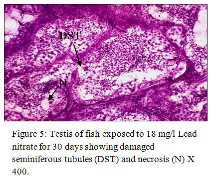 Figure 5: Testis of fish exposed to 18 mg/l Lead nitrate for 30 days showing damaged seminiferous tubules (DST) and necrosis (N) X 400. Click here to View Figure |