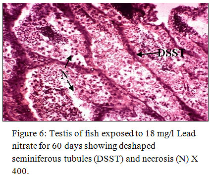Figure 6: Testis of fish exposed to 18 mg/l Lead nitrate for 60 days showing deshaped seminiferous tubules (DSST) and necrosis (N) X 400. Click here to View Figure |