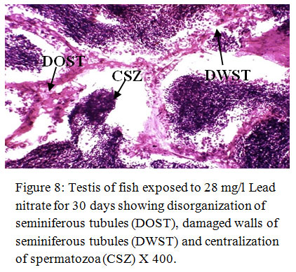 Figure 8: Testis of fish exposed to 28 mg/l Lead nitrate for 30 days showing disorganization of seminiferous tubules (DOST), damaged walls of seminiferous tubules (DWST) and centralization of spermatozoa (CSZ) X 400. Click here to View Figure |