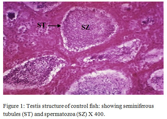 Figure 1: Testis structure of control fish: showing seminiferous tubules (ST) and spermatozoa (SZ) X 400. |