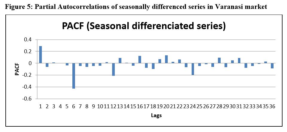 Figure 5: Partial Autocorrelations of seasonally differenced series in Varanasi market. Click here to View figure |