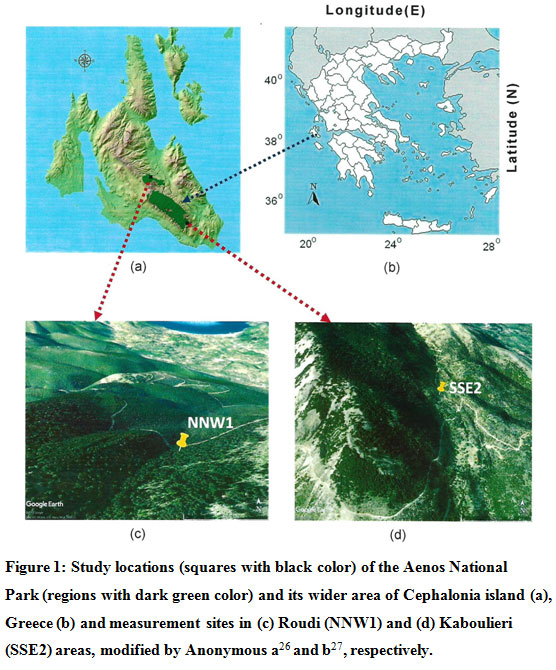 Figure 1: Study locations (squares with black color) of the Aenos National Park (regions with dark green color) and its wider area of Cephalonia island (a), Greece (b) and measurement sites in (c) Roudi (NNW1) and (d) Kaboulieri (SSE2) areas, modified by Anonymous a26 and b27, respectively. |