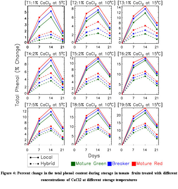 Figure 4: Percent change in the total phenol content during storage in tomato fruits treated with different concentrations of CaCl2 at different storage temperatures Click here to View table |