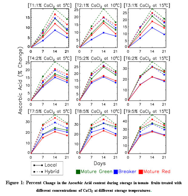 In conclusion, tomato fruits harvested at breaker stage retained the significantly higher amount of Ascorbic Acid after 14 days of storage compared to fruit harvested at the mature green and red stage. Additionally, our investigations are suggestive of 1% CaCl2 treatment to be the most effective in terms of offering a definitive control in the rate of evolution of non-enzymatic antioxidants of the tomatoes such as lycopene and carotenoids. Further, although Hisar Arun (Local) variety is found to retain more nutritional content than Kashi Vishesh (hybrid) variety, latter shows higher shelf life.