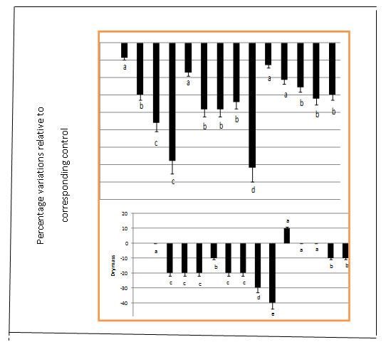 Figure 1: Variation in percentage ratios of treatments in the growth medium on fresh and dry mass in roots of wheat relative to absolute control. Values are means ± SD based on three independent determinations and bars indicate standard deviations, different letters means significant difference as evaluated by Duncan’s’multiple comparison test. |