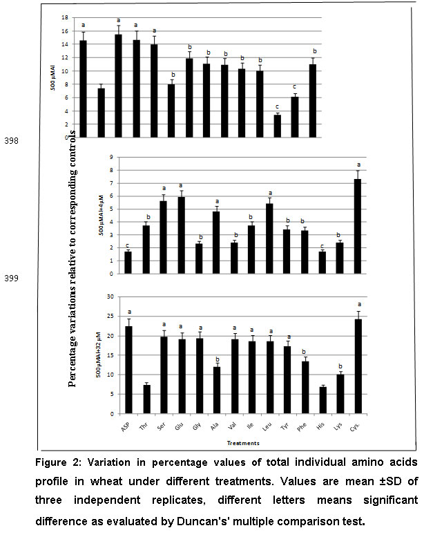 The current study demonstrated that Al enhanced 14 individual amino acids in addition to proline in root of wheat cultivar Sakha 93 (Table 4) as compared to the absolute control. The Al-induced increase in amino acid content was associated with a decrease in total protein, thus indicating that Al retarded the assembly of amino acids into proteins in roots of wheat seedlings cultivar Sakha 93. Levels of amino acids most notably proline, the glutathione forming amino acids cysteine, glycine and glutamic and the branched chain amino acids (BCAAs) leucine, isoleucine and valine were increased under Al stress. Leucine, isoleucine and valine, the branched chain amino acids (BCAAs), where increased significantly in the tolerant wheat cultivars. Accumulation of BCAAs as well as a number of other amino acids,51 increased under dehydration stress and was regulated at the transcriptional level. In other study also recorded that increased BCAAs under drought stress in Arabidopsis, but not to the same extent.52
