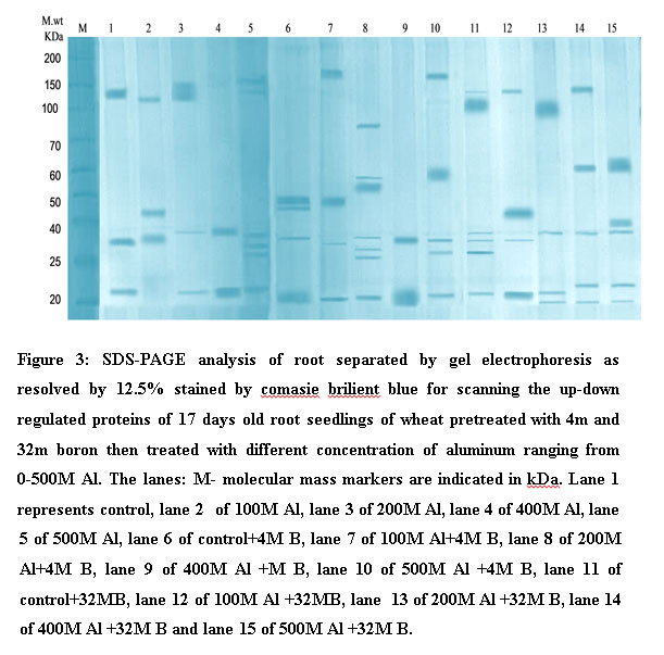 The electrophoretic pattern of water and boron treated wheat roots showed number of major six polypeptides of different band’s intensity with molecular masses 121, 107, 36, 30, 27 and 21kDa. Peptides with molecular masses 125, 46, 37 and 21kDa were synthesized in wheat roots after treatment with 100 µM Al in seedlings pretreated with 32 µM B. At 200 µMAl, peptides with molecular masses 103, 38, 21 and 20kDa were synthesized, while peptides with 45, 44 and 36 were disappeared. Low and high molecular masses peptides were synthesized in response to 400µM Al pretreated with 32 µM B with 143, 62, 39, 24 and 20kDa. On the other hand, low molecular masses peptides were synthesized in response to 500µM Al pretreated wheat seedlings with 62, 43, 39,22 and 20 kDa with 59, 8,7,14 and 11 band intensities, respectively (Table 5). We speculate that in wheat, certain proteins may be involved in tolerance to Al toxicity and are formed due to interaction between Al and Boron and are involved in Al tolerance.