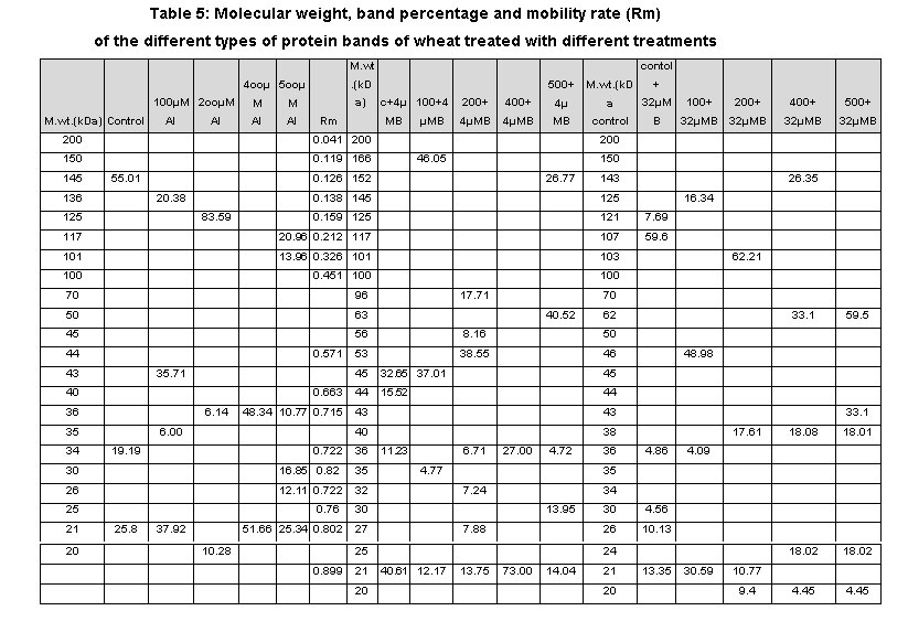 Application of 4µMB in control samples revealed the presence of four low molecular masses with 45, 44, 36 and 21kDa with corresponding band intensities 32, 15, 11 and 40, respectively. Several peptides with different band intensities were synthesized after treatment with different concentrations of aluminum (Table 5). Peptides with molecular masses 166, 45, 35 and 21kDa were synthesized in wheat roots after treatment with 100 µM Al in seedlings pretreated with 4 µM B. At 200µMAl, peptides with molecular masses 96, 56, 53, 36, 32, 27, 21kDa were synthesized, while peptides with 45, 44 and 36 were disappeared. Two low molecular masses peptides of 36 and 21kDa were synthesized in wheat roots in response to 400µM Al pretreated with 4µM B. At 500µM concentration of Al, polypeptides with molecular masses 152, 63, 36, 30, 21kDa were synthesized, while peptides with molecular masses 45 and 44 were disappeared in seedlings pretreated with 4µM B. These results indicate that in wheat, certain proteins may be involved in tolerance to Al toxicity and are formed due to interaction between Al and Boron.