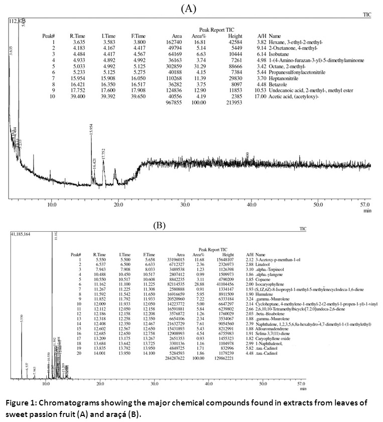 Figure 1: Chromatograms showing the major chemical compounds found in extracts from leaves of sweet passion fruit (A) and araçá (B). |