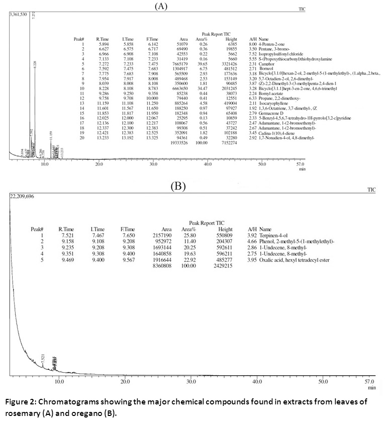 Figure 2: Chromatograms showing the major chemical compounds found in extracts from leaves of rosemary (A) and oregano (B). |