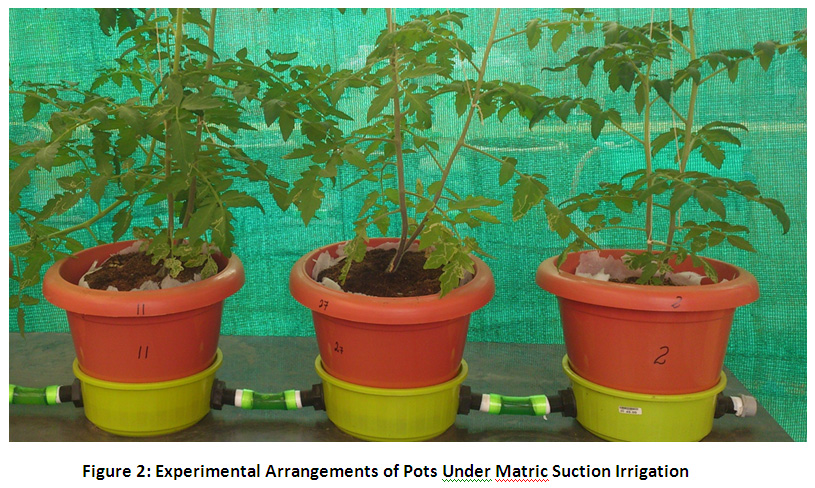 In the present study tomato crop was raised in pots in a green house with a set up to provide water to the pots by matric suction irrigation. In each pot grow bag media was filled and the crop was raised.