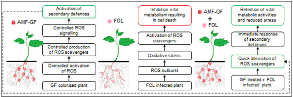 Abbreviations: Reactive Oxygen Species (ROS), Arbuscular mycorrhizal fungi (AMF), Glomus fasciculatum (GF), Fusarium oxysporum f. sp. lycopersici (FOL)