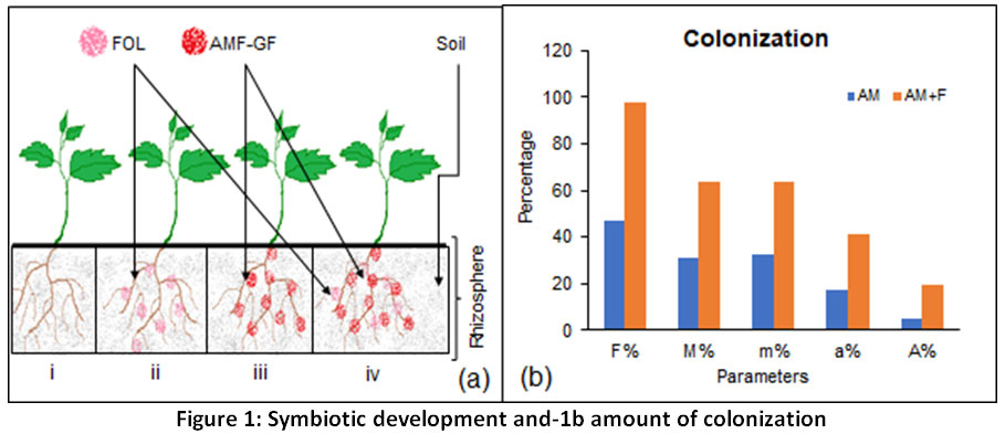 The frequency of GF colonization in the FOL microconidia inoculated root system was obtained similar as mycorrhizal roots not inoculated with pathogen. The colonization intensity and arbuscule abundance in the FOL microconidia inoculated root system was also obtained similar as mycorrhizal roots not inoculated with pathogen (Figure 1b).