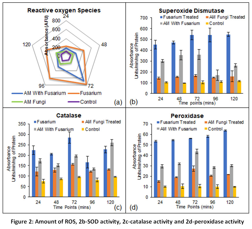 Plants are for its highly versatile defenses owing to the immobile nature. They have developed various tiers of immune responsive strategies to withstand biotic and abiotic stresses. Unlike animals, plants rely on their innate immune responsive machinery as they lack specialized immune cells. Therefore, they employ a two-tier immune responsive apparatus.1 The first tier is a surface-localized pattern recognition receptors (PRRs) leading to PRR-triggered immunity (PTI).2 The second tier consists of intracellular immune receptors, mostly NOD type receptor, which directly or indirectly identifies virulence effectors secreted within host cells by pathogens, thereby inducing effector-triggered immunity. First-tier immune response specifically PTI immunity involves, rapid generation of ROS as an immediate response to biotic stress experienced by plants. Reactive Oxygen Species (ROS) is a proven defense regime employed by plants. ROS system further normalizes upon activation of subsequent tiers of plant immunity system.3 ROS and antioxidant enzymes are primary immune responses to the biotic stress induced by Fusarium oxysporum f. sp. lycopersici (FOL) on tomato (Solanum lycopersicum var. Pusa Ruby) plant4. Fusarium wilt disease in tomato may lead to a whopping 10-90% loss in yield.5 Therefore, besides being known as a popular cash crop, it is also treated as a model plant system for plant–pathogen interactions.6 FOL is one such pathogen studied for causing infection in tomato plant. It is a well-known soil borne pathogen which segregated from its non-pathogenic Fusarium oxysporum ancestor6 and is known to produce Fusarium wilt disease in Tomato plant further triggering immune responsive machinery.7,8 The immune response generated in the form of ROS and antioxidant enzyme approach is further alleviated by application of Arbuscular Mycorrhizal Fungus (AMF) Glomus fasciculatum (GF) to the plant under study. AMF symbiosis in cash crops will play a significant role to evaluate the potential of and burden on First-tier immune response. Similar studies are carried out earlier focusing mainly on evaluation of phenotypic characters instead of ROS pathway.9,10 Our study shall answer few fundamental questions, which cater a relationship between first-tier immune responsive machinery i.e. ROS pathway in Tomato with that of GF application, possibly potentiating the plant against FOL induced biotic stress. Moreover, LC-MS of FOL revealed some novel compounds, which can be correlated to the pathogenicity of FOL and its ability to generate high ROS and antioxidants in FOL treated plants. These compounds can be targets for agriculturalists and scientists towards mitigating FOL related infections in future. Therefore, a time-dependent renaissance in various tiers of innate immune responses of AMF-GF treated plants may be evaluated through such studies to tackle fungal infections.