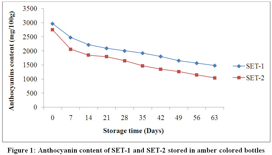 Figure 1: Anthocyanin content of SET-1 and SET-2 stored in amber coloured bottles. Click here to View Figure |