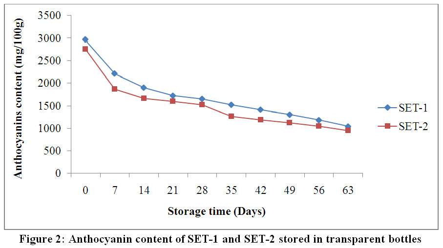 Figure 2: Anthocyanin content of SET-1 and SET-2 stored in transparent bottles. Click here to View Figure |