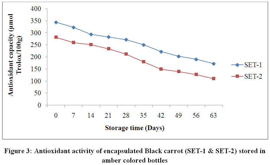 Figure 3: Antioxidant activity of encapsulated Black carrot (SET-1 & SET-2) stored in amber coloured bottles. Click here to View Figure |