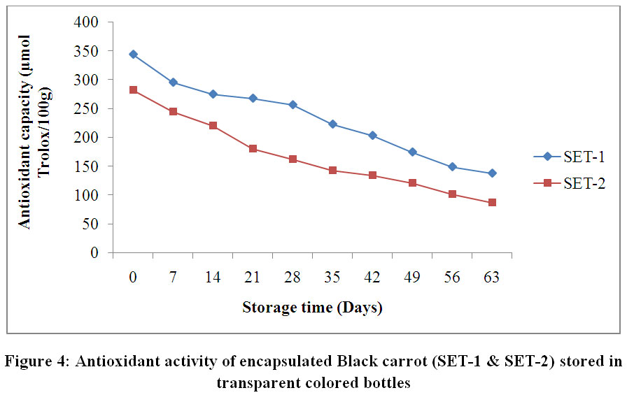 Figure 4: Antioxidant activity of encapsulated Black carrot (SET-1 & SET-2) stored in transparent coloured bottles. Click here to View Figure |