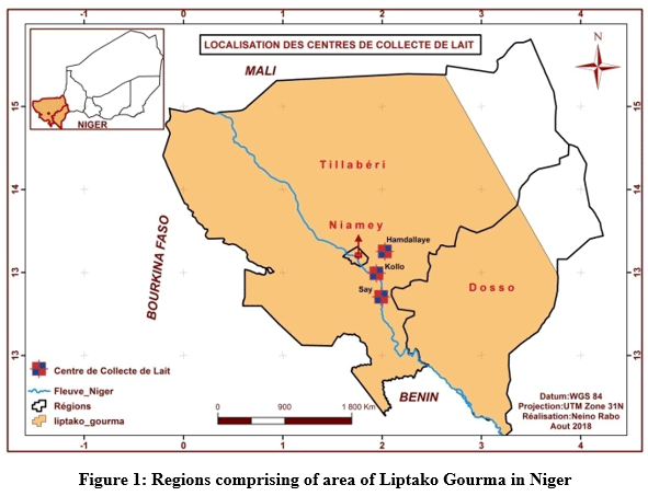 This study was conducted in the area of Liptako-Gourma located in between the borders of Burkina Faso, Mali and Niger. It covers 9.7% of the whole Niger’s area and is made up of the regions of Dosso, Niamey and Tillaberi. The dairy basins of the capital Niamey, where demand for the dairy products is greater than supply, are located within that area. There are three collection centers located in Kollo, Hamdallaye and Say (Figure 1). The dominant economic activity is agriculture and livestock, which are hampered in their development by the inaccessibility to water and the invasion of the Niger River by the water hyacinth. A cross-sectional survey was conducted to collect data.
