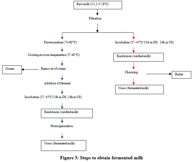 - Fermentation of milk is obtained naturally without adding inoculum. This type of fermentation is practiced by 42.90% processors and mainly by the Fulani women. The raw milk milked during the early evening (6 to 7 pm) is allowed to ferment spontaneously overnight at room temperature in the households (Figures 2 and 3). The curdled milk (kindirmou) thus obtained can be sold and consumed, or it is homogenized with a wooden stick to give a product called locally “nono”. The consistency of the “nono” varies from slightly smooth to lumpy. It can be kept for 4 to 5 days in the hot season and up to 1 week in the cold season (temperature averages between 15 and 34°C, down to 9° C);