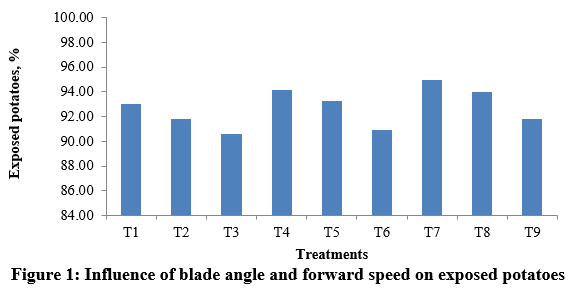 The mean values of exposed potatoes at different forward speed and blade angle are shown in Fig.1 and Table 3. From Fig. 1 and Table 3 it can be seen that as the forward speed of digger increased from 2.3 to 3.3 km h-1, the exposed potatoes increased from 93.04 to 94.98 per cent at blade angle of 170.