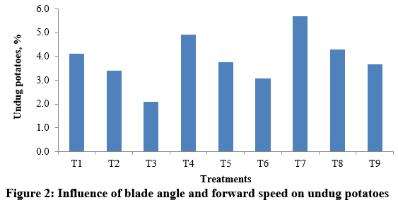 Figure 2: Influence of blade angle and forward speed on undug potatoes. Click here to View Figure |
