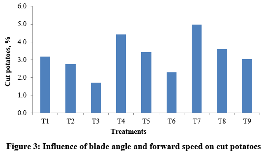 The influence of forward speed on cut potatoes was significant at 1 per cent level of confidence. The effect of blade angle was also significant at 1 per cent level of confidence. The interaction effect of forward speed and blade angle was non- significant.