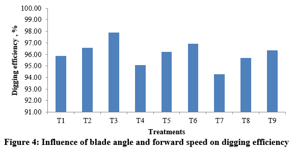 From Fig. 4 and Table 4, it can also be seen that as the blade angle of digger increased from 170 to 230, the digging efficiency increased from 95.88 to 97.90 per cent at forward speed of 2.3 km h-1. Similarly the digging efficiency increased from 95.10 to 96.92 per cent and 94.31 to 96.34 as blade angle increased from 170 to 230, at speed of 2.8 km h-1 and 3.3 km h-1, respectively. The digging efficiency was found to be 100 % by conventional method.