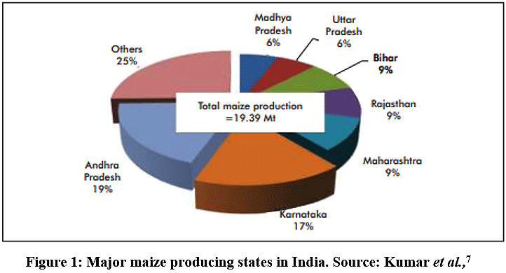 Maize (Zea mays, L.) is the third most important food crop after rice and wheat with a production of about 28.72 million tons in 2017 in India.1 The crop is traditionally produced in Madhya Pradesh, Uttar Pradesh, Jharkhand, and Bihar States which account for about 50% of the total national maize production (Figure 1).2 Nationally, the crop contributes about 9% of the national food basket and generates about 100 billion to the agricultural GDP.3 This is due to the important roles it plays in the manufacturing and processing industries: 55% of total production is consumed as livestock and poultry feeds while only 25% for human consumption and about 11% for other industrial purposes.4