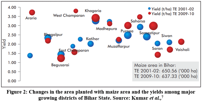 Figure 2 Figure 2: Changes in the area planted with maize area and the yields among major growing districts of Bihar State. Source: Kumar et al.,7