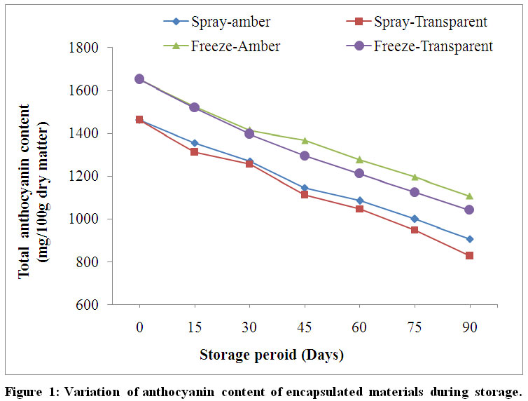 Today food industries are trending towards the development of functional ingredients is under consideration with therapeutic and nutritional values.8-14 Various techniques are followed for the encapsulation process and most important for food applications include spray and freeze drying. Ersus et al.,1 used spray dryer for encapsulation black carrot anthocyanin pigments and Wilkowska et al.,14 used both spray and freeze drying for encapsulation of blueberry juice. Microencapsulation is one such technology through which any solids, liquids, or gaseous materials can be packed in miniature sealed capsules that would protect the core material from external environment.15-21Ferrari et al.,22 also reported storage stability of microencapsulated blackberry juice powders stored at 25ºC found the significant changes in the monomeric anthocyanin content with respect to a gradual increase in storage period.