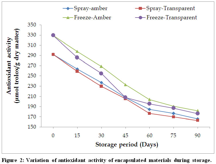 Figure 2 Figure 2: Variation of antioxidant activity of encapsulated materials during storage.