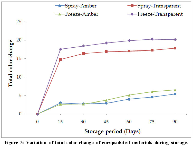 Figure 3 Figure 3: Variation of total color change of encapsulated materials during storage.