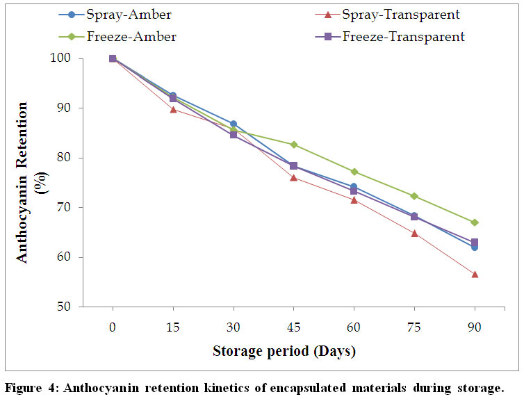 Idham et al.,30 reported similar results for spray dried red color powder from Roselle calyces. The results indicate that the half-life followed a first-order kinetics and if encapsulation is carried out using spray drying and stored in amber colorairtight vials, anthocyanins can be effectively retained for 130 days whereas if the same is prepared using freeze-drying and stored in airtight amber containers the shelf life of the anthocyanin can be extended upto 155 days. Similar trends of anthocyanin degradation kinetic were reported by Wang et al.,31 for blackberry juice and concentrate during storage at 37ºC, respectively.